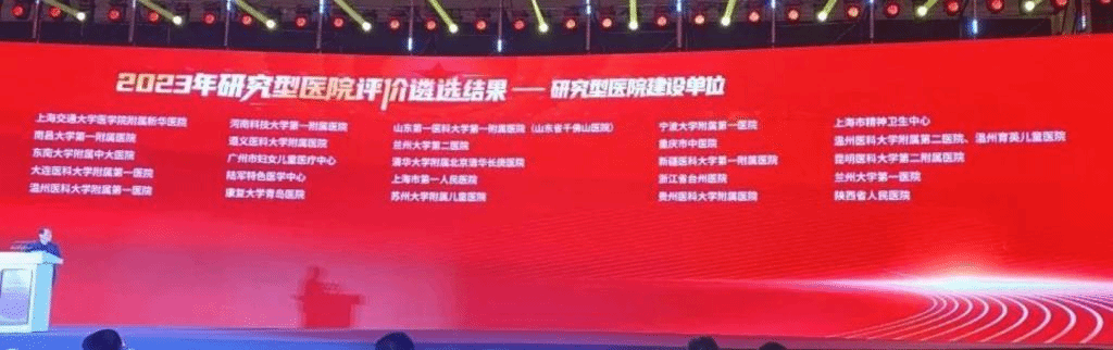 2023年10月21日,中国研究型医院高峰论坛大会在南京召开,会上公布了2023年研究型医院评价遴选结果,并对医学研究和创新实践工作中做出突出贡献的科技人员及创新项目进行了表彰。