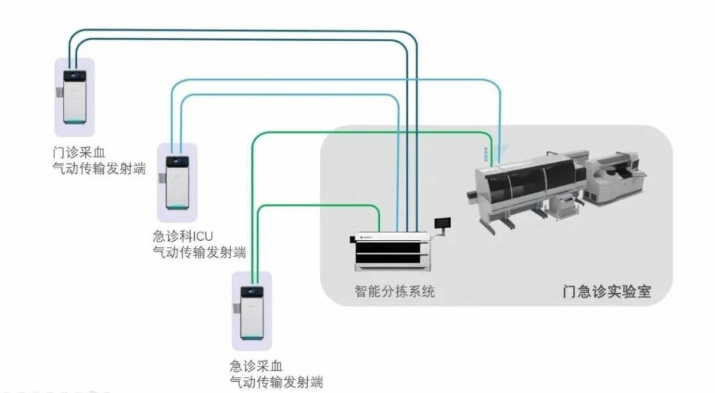 此外,气动传输系统还与门急诊实验室分拣核收系统连接,气动系统能够直接发射样本到分拣系统,分拣系统能够实现标本的自动核收、分拣与录入,可不停机由工作人员直接取出分拣好的样本再进下一步检测,或直接发送到流水线进行检测。整个运输流程可实现样本自由灵活地处理,进一步减少实验室人力支出,优化整体工作流程。