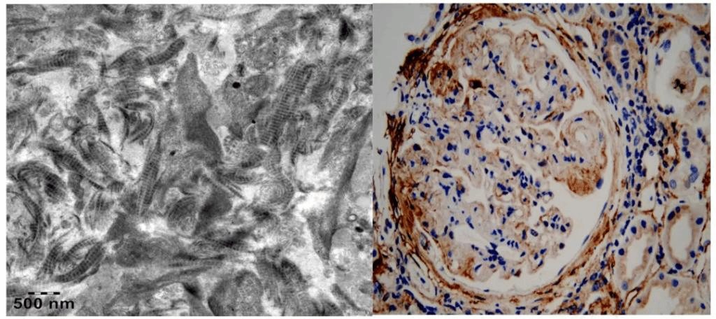 2023年12月8日,新医大一附院肾脏疾病中心收治了一例特殊的患者,该患者临床表现为肾脏受累,符合常见的慢性肾炎综合征,但肾穿刺活检病理诊断不寻常,经电镜检查发现肾小球系膜区和基底膜有大量带横纹的束状胶原纤维,直径在40~70 nm。为了明确诊断,进一步通过全外显子检查除外法布雷病,加做免疫组织化学染色表现为Ⅲ型胶原纤维阳性。