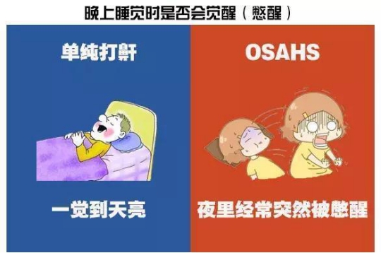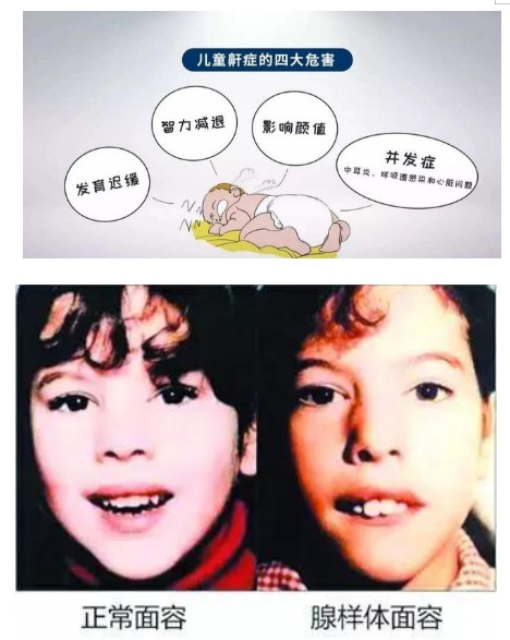 当儿童出现OSAHS症状,更需引起家长的高度重视,这里不是危言耸听,特别是在生长发育阶段,儿童常常是由于鼻腔后端的腺样体肥大阻塞后鼻孔,因患儿鼻腔呼吸受限制,经常张口呼吸,会出现颌面发育畸形,长期的缺氧则会影响生长发育、胸廓畸形,大脑的长期缺氧则会导致神经发育落后,从而学习成绩下降,从而影响终生。不要让自己的孩子输在健康的起跑线✭