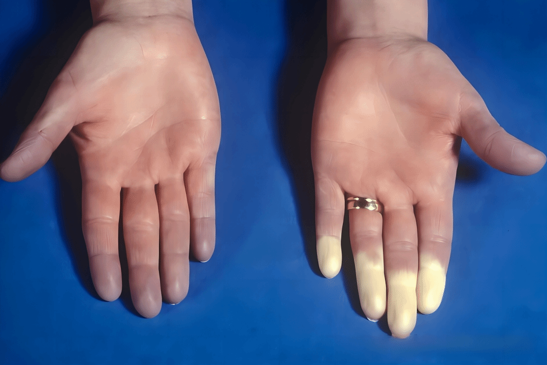 如果雷诺现象反复发作,导致指甲和皮肤营养障碍,会出现手指皮纹减少、皮肤变硬、指腹变薄、指端溃疡和小面积坏疽,常伴有剧烈疼痛,溃疡愈合后可遗留点状皮肤瘢痕。
