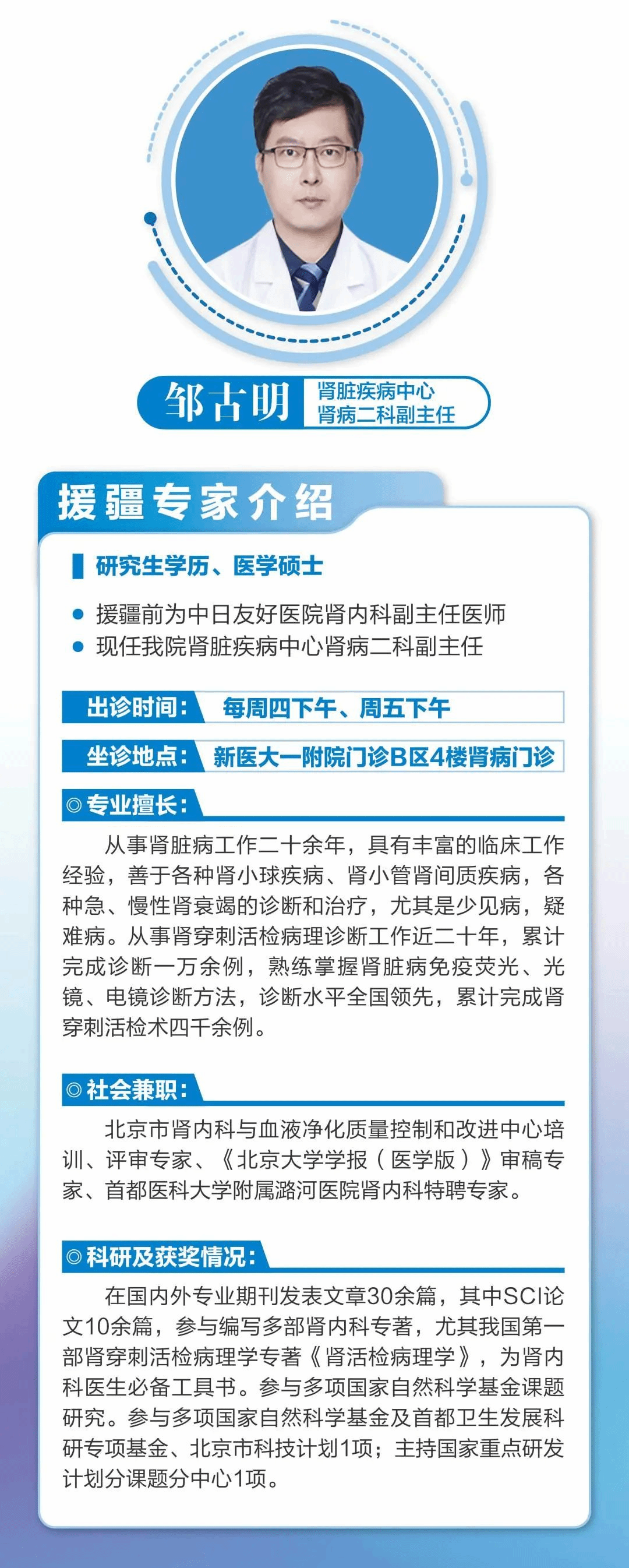 2023年7月,中组部第十一批援疆干部——中日友好医院肾内科专家邹古明教授来到新疆医科大学第一附属医院肾脏疾病中心开展对口支援工作。在近半年的时间里,邹古明教授充分发挥桥梁和纽带作用,在促进学科交流、提升专科水平、加强科研创新等方面与新医大一附院医务人员一同携手,共同助推医院肾脏病学科高质量发展。
