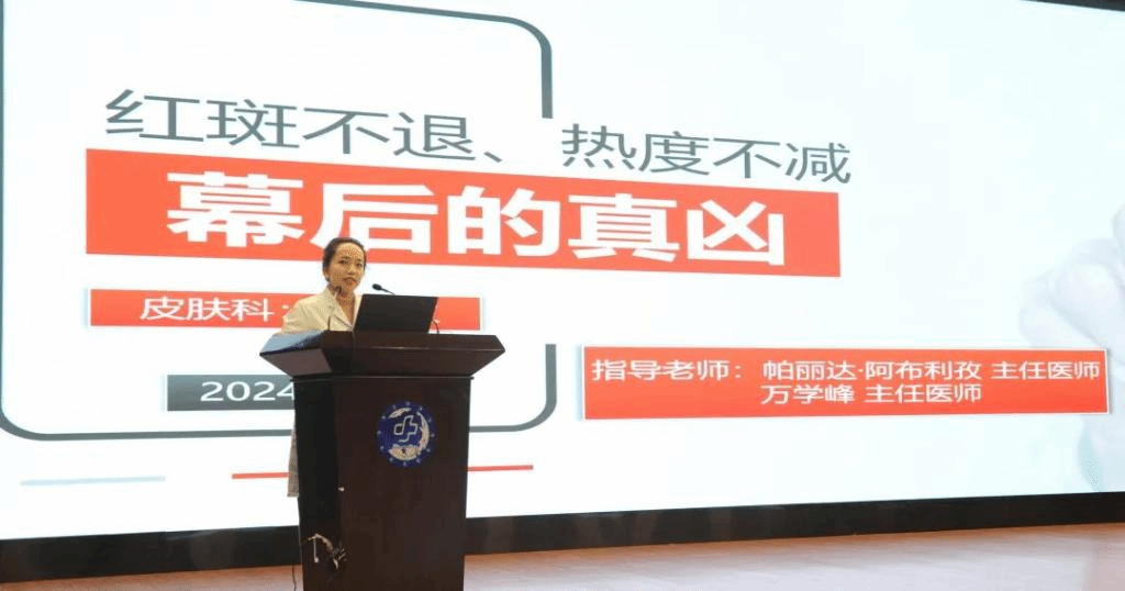 皮肤科热依拉·阿不烈孜医师以《红斑不退、热度不减幕后的真凶》为题进行病例分享。14岁的患儿咳嗽、流涕10天,遂出现发热和皮疹,家长自行给予药物口服治疗,疗效欠佳;来院前1天患儿颈部出现密集分布红色皮疹,逐渐累及面部,伴有瘙痒、发热等症状,门诊立即收入院治疗。