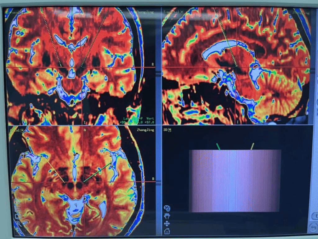 手术前日,神经外四科团队为患者进行了术前预计划、靶点预定位。3.0T磁共振兼容可充电脑起搏器的植入需要比以往更加精准的定位和操作,结合张女士临床表现与病史,团队决定植入以丘脑底核(STN)为植入靶点。手术当日,准确计算出靶点坐标后,团队顺利植入电极,张女士目前状态良好,手抖等症状已获得好转。