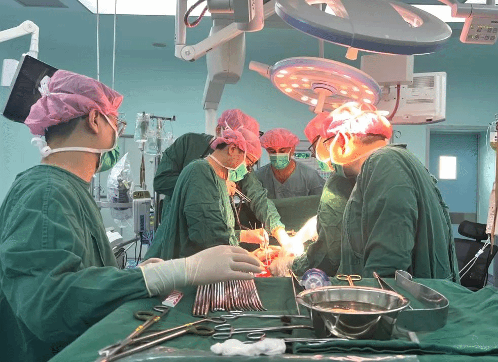 经过周密的术前讨论、术式规划、应急预案和充分医患沟通后,2024年3月21日,在新医大一附院温浩教授、吐尔干艾力·阿吉教授、邵英梅教授、麻醉科、重症医学中心以及中心手术室等科室的密切协作下,术中首先将腹腔内巨大的包虫病灶以及被其侵及的肝脏、胰头在内的多脏器完整地移出体外;随后手术团队在离体状态下对肝脏病灶进行了切除及血管修补重建后剩余的肝脏被重新移植回患者体内;最后,在依次完成了胰-肠、胆-肠以及胃-空肠吻合,历经16小时手术顺利结束。