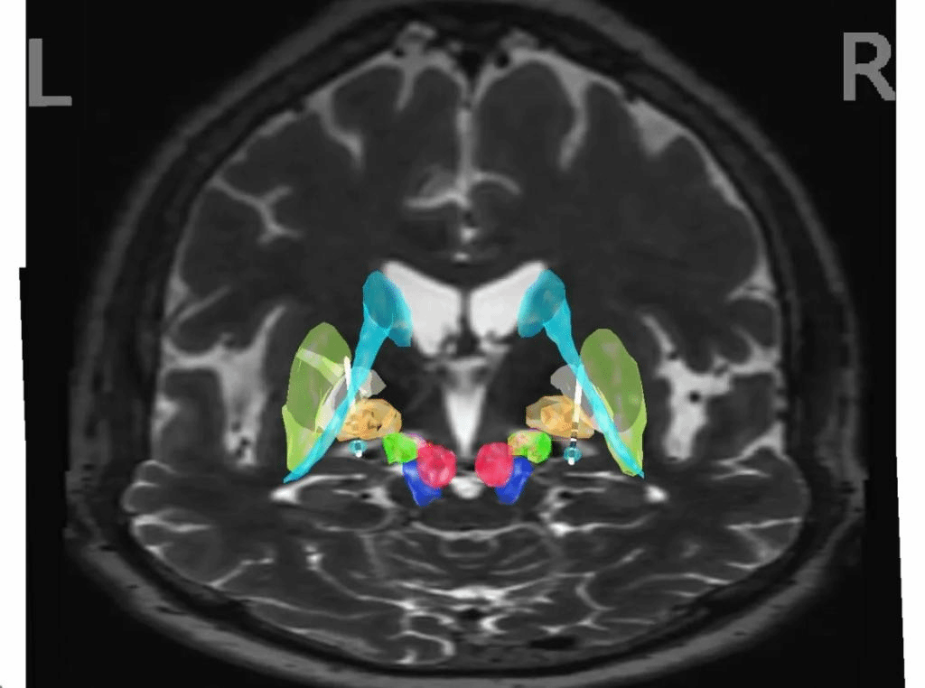 住院后,治疗团队为李阿姨完善了相关检查并制定了详细的手术方案。为了更精准地将刺激电极植入核团,团队决定采用先进的手术机器人来辅助植入定位。手术当日,团队使用手术机器人的导航系统将CT与术前完善的MRI进行图像融合,核团定位,植入路径的设置,并且在术中使用电生理监测,找到最典型的核团电信号。最终团队在手术机器人辅助下结合电生理监测工具,将电极精准植入到核团。