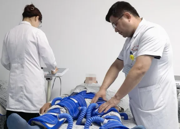 体外反搏(EECP)是一种治疗多种缺血性疾病的无创性辅助循环技术。它通过在患者的小腿、大腿及臀部分段包裹特制的气囊套,在心电R波的触发下,气囊由下至上序贯充气,挤压人体下半身的动脉系统,在心脏的舒张期将血流驱回至人体上半身,从而改善心、脑等重要脏器血流灌注,同时可使双下肢静脉回心血流增加,从而提高心输出量。体外反搏治疗能够使患者在轻松、舒适中安全地促进血管内血流加速运动,明显缓解胸闷、胸痛、心前区不适等症状。