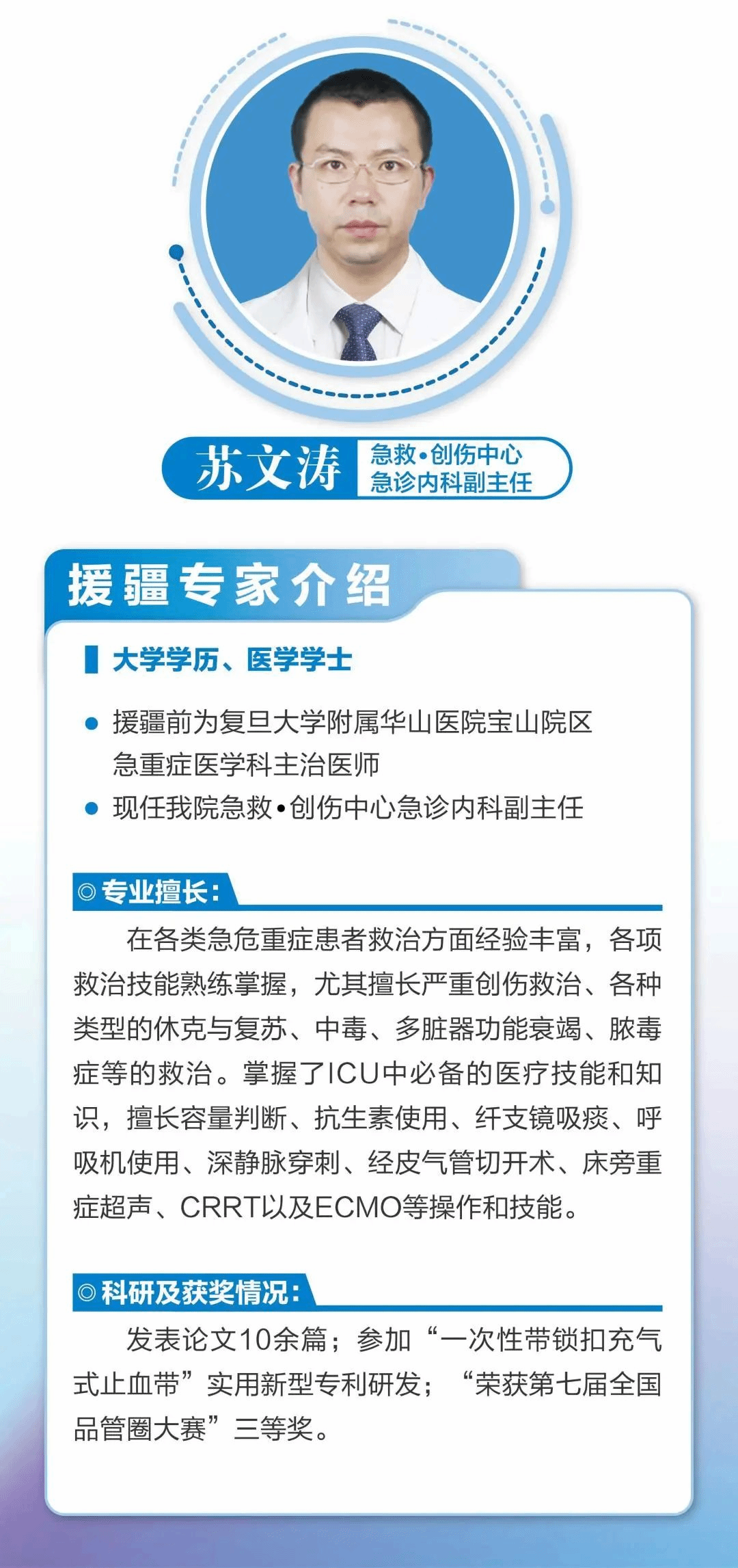 2023年8月,中组部第十一批援疆干部、上海复旦大学附属华山医院急重症医学科援疆专家苏文涛,来到新疆医科大学第一附属医院急救·创伤中心开展对口支援工作,担任急诊内科副主任,主要负责急诊综合二病区的工作。